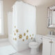 Modern shower curtain features a simple gold starburst pattern on a white background. Each starburst features a light golden star overlapping with a larger sparkly copper starburst. A simple, clean mininmalist design,