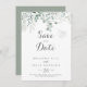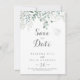 This minimalist greenery eucalyptus wedding save the date is perfect for a rustic wedding. The design features watercolor elegant green eucalyptus leaves.