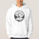 This hoodie design features a minimalist black-and-white illustration of two hikers walking along a winding trail towards towering mountains in the distance. One larger and one smaller hiker, wearing backpacks and holding trekking poles, embodies a sense of adventure and exploration. Framed by tall evergreen trees, jagged mountains, and clouds in the sky, the entire scene is encased in a circular border for a cohesive and balanced look. This design perfectly captures the spirit of outdoor adventure and a deep connection with nature, making it ideal for hiking enthusiasts and those who love exploring the wilderness.