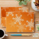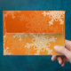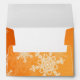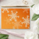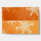 Lovely, modern and trendy festive pattern with white snowflakes on an orange background. It features an orange background and is adorned with white snowflake pattern that cover its surface. The snowflakes are detailed with fine lines, creating an intricate lace-like effect. The overall style is charming and joyful, with a clear holiday theme. Perfect Christmas envelope for Christmas cards and Christmas party invitations