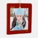 This ornament is simple yet beautiful. It features your photo in a red frame with the word Joy in the top left corner and your family name or signature along with the year in the bottom right corner in gold text. The design is minimalist and clean. The back features the repeating words peace, love, joy, light. Wonderful Christmas gift or holiday memento.