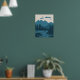 A vintage style poster with a minimalist landscape illustration of a lake with trees and mountains in blue tones on a beige background: perfect wall art for office or home decoration.