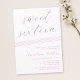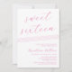 This modern minimalist sweet 16 invitation features a trendy calligraphy script font and lines. The elegant pink and white design is perfect for a formal trendy sweet sixteen birthday party.