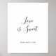 This minimalist love is sweet wedding sign is perfect for a simple wedding. The modern romantic design features classic black and white typography paired with a rustic yet elegant calligraphy with vintage hand lettered style. Customisable in any colour. Keep the design simple and elegant, as is, or personalise it by adding your own graphics and artwork. Customise the wording to say anything you'd like!