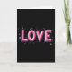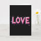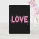 This greeting card centers on the word “LOVE” in large, uppercase letters that fill most of the front. The letters are hot pink and magenta, set on a deep black background, and they look slightly raised because they’re made of many thin horizontal lines. Around the edges, the word breaks into small streaks and specks of neon pink, cyan, and electric blue, like a digital flicker spreading outward. The “LOVE” text sits right in the middle, and its letter style feels modern and sharp, with bright color that stands out clearly against the dark. Even without any characters or a scene, the design feels like a strong, honest way to say what’s in your heart ❤️. It’s meaningful because it keeps the message simple, but the shifting colors and little fragments make it feel alive and real, like love can be intense and a bit messy 🥰.