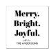 Enhance your holiday stationery and gift wrapping with this minimalist Merry. Bright. Joyful. custom rubber stamp. Designed in a timeless typography style, this stamp creates a clean and polished impression on envelopes, gift tags, packaging, and festive crafts. Personalize with your family name for a sophisticated touch that makes every detail feel special.