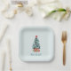 Minimalist mint green Christmas-themed paper plates with a snowy pine tree and a customizable text "Merry Christmas" at the bottom.