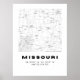 This minimalist Missouri map design features a sleek black and white aesthetic with coordinates, highlighting the Show-Me State in a modern style. Ideal for home or office decor, this piece celebrates Missouri with a clean and contemporary look.