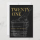 Modern minimalist 21st birthday party invitation features stylish gold text saying Twenty One and your party details in classic serif font on black background colour, simple and elegant, great surprise adult milestone birthday invitation for men and women. The black background colour can be changed to any colour of your choice. it also features a champagne bottle in a bucket in light grey.