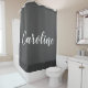 Simple shower curtain with modern and elegant personalised name design in black and white.