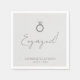 Engagement party napkins in a minimalist grey typography design. Sparkling engagement ring and the word "engaged!" across the napkin in a script font and the message "Congratulations" underneath. Customise with the names of the couple.