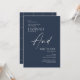 These 5" x 7" formal wedding invitations feature a minimalist style design with light grey lettering on a navy blue background with the following placeholders, honorific, parent name, introduction, wedding couple first and last names, day of the week, date, time, venue, venue address and reception.