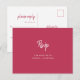 These elegant, minimalist wedding response postcards feature modern script typography and clean, sans serif text for a simple and stylish magenta red and white design you will love. There is room to add your guests options for meal choice of entrée or dinner choice. Text is kept away from the top and bottom edges of the back of the postcard, to lessen the chance of it being covered on the top and bottom by postal markings.
