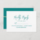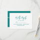 Minimalist, modern white and teal wedding response card with gold rope heart at the back and simple handwritten calligraphy script.