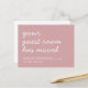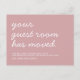A moving announcement postcard in pastel pink background featuring a simple and casual hand lettering saying "your guest room has moved". Personalise the details to your own liking.