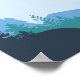 A poster with a minimalist illustration of a picturesque landscape including mountains, trees and a body of water in blue and green tones: perfect wall art for office or home decoration.