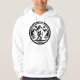 This hoodie features a striking black-and-white silhouette of a hiker trekking through a scenic mountainous landscape. The central figure carries a backpack and hiking stick, surrounded by towering evergreen trees and jagged mountain peaks in the background. Above the mountains, a small cloud and sun add to the nature-inspired scene. Enclosed within a circular frame, the clean lines and geometric shapes give this design a modern, minimalist aesthetic, making it perfect for outdoor enthusiasts, nature lovers, and hikers who appreciate adventure and exploration.
