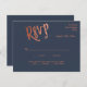 Create a personalised and splendid, chic, and elegant RSVP insert card for your wedding reception, banquet, or party event. This enclosure insert card features features spacious and beautiful calligraphy script writing in faux rose gold foil letting and with a navy background.. You can easily customise it with your own text and customise it to your liking. Please note: "RSVP -by- " and graphic artwork cannot be edited. Additional Note: The gold foil print is a faux rose gold foil effect. It is NOT the actual hot stamping rose gold foil.