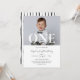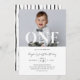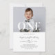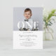 Minimal and clean birthday party invitation card featuring your child's photo with the word "ONE" on top of the picture.