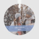 Minimalist, elegant Our First Christmas Together personalised photo Xmas ornament for recent couples, with modern cursive typography / hand lettering on a stylish semitransparent blue band and a frame of white and silver snowflakes and little stars. Make sure you personalise at least the two photos (front and back), and the first and last names and year on the back.