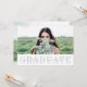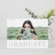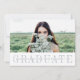 This modern minimalist graduation photo announcement features your favourite landscape orientated or horizontal photo on the front, with "graduate" displayed beneath in elegant grey-blue lettering. Personalise with your name, school and graduation year on a sheer white stripe overlay. Cards reverse to an additional photo alongside your grad party details. A simple and elegant graduation announcement and party invitation by Redwood & Vine Design Co.