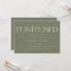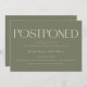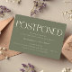 Postponing a big event like your wedding can be stressful, but you can still look stylish with this modern and minimalistic change of plans template card. It says "postponed" in stylish and noticeable font at the top followed by your event information and regrets. The background is sage green.