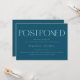 Postponing a big event like your wedding can be stressful, but you can still look stylish with this modern and minimalistic change of plans template card. It says "postponed" in stylish and noticeable font at the top followed by your event information and regrets. The background is teal.