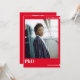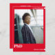 A minimalist photo PhD graduation party invitation with white text and a red background. The back includes the graduation party details and a smaller version of the graduate’s photo. Simply add your photo and information, add this invitation to your cart, and celebrate this major accomplishment.