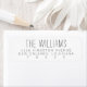 A modern, self-inking return address stamp with a sleek, capital script font on top paired with a thin, classic font on bottom for a very minimalist feel. Customise with your first and last name, family name, or company name for everyday or special occasion use.