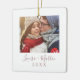 This minimalist rose gold couples keepsake photo ceramic ornament is the perfect simple Christmas tree decoration. The design features classic blush pink and white typography paired with a rustic yet elegant script font with hand lettered style. Personalize the front of this keepsake ornament with a photo, your names and the year. Personalize the back with another photo.