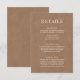 Designed to coordinate with our Minimalist Rustic Collection, this customisable details enclosure card features a white classic font on a kraft effect background. This is a simple and minimalist rustic collection, very versatile and suitable for any wedding season. For more advanced customisation of this design, e.g. changing layout, font or text size please click the "CUSTOMIZE" button above. Please contact me for any questions!