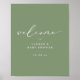 A simple gender neutral baby shower welcome poster. "welcome" is in white modern calligraphy style font, on a sage green background. Personalize with event details.
