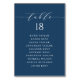 Customisable table number seating plan. It features a navy blue and white whimsical script and classic typography. Personalise by adding your own details. This minimalist table seating plan is perfect for weddings, baby showers, bridal showers, birthdays, and so much more.
