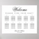 A simple, minimalist seating chart with 10 tables, recommended for a wedding, but can be used for any other celebration. The background is white. All text is black. The word Welcome in the upper part and the bride and groom names in the lower part are written in an elegant calligraphic script, the rest in caps.