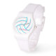 This sporty volleyball themed wristwatch for girls features a pair of simple, minimalist style volleyball graphics (showing only the volleyball's seams in turquoise and pink) that are slightly offset from each other on a white background - customise with her name - by katz_d_zynes