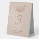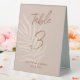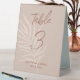 Minimalist terracotta tented table numbers featuring a palm leaf silhouette and modern script font. Perfect for boho chic, desert, and rustic weddings where guests need easy-to-read table numbers that stand on their own. Personalise with your names and date to complete your coordinated wedding stationery suite.