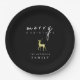 Modern minimalist black and white Christmas paper plates designed with a hand-painted watercolor gold reindeer and modern typography. Personalise for stylish gifting holiday treats