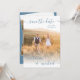 Simple and modern wedding save the date invitations with one large photo on the front, that you change and three on the back. Pretty typography script. This one features a boho couple in the field but any grouping of photos with looks great! Dusty blue