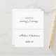 A minimalist, black and white wedding place card with the guest name and the table number printed on its front and the bride and groom names and the wedding date printed on the other side (that is the other half, before folding it). All text is black calligraphic script, the background is white.