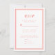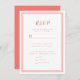 Simple and elegant, this modern wedding RSVP enclosure card features a minimalist design with a double frame border in popular coral on a crisp white background. Personalise with the date of your wedding and selected menu items. Spaces provided for your guest to add their names and responses for a return reply. Lettering and script are in matching coral. The back of the card is matching solid coral. Be sure to see our matching return address labels in a separate listing: https://www.zazzle.com/simple_wedding_rsvp_coral_white_label-106674204832850864