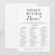 Introducing the "What's In Your Purse?" Bridal Shower Game Card by CaMiDesigns! This stylish minimalist design features a chic black and white theme, perfect for adding a touch of elegance to any bridal shower celebration. Guests will enjoy the fun and engaging challenge of finding various items in their purses, making it a memorable addition to the festivities. Designed with simplicity and sophistication in mind, this game card is sure to entertain and delight.