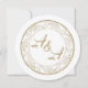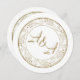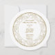 A beautiful minimalist white and gold wedding invitation with a circle element and gold text.