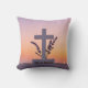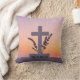 Minimalist white cross adorned with lavender sprigs and a gradient sunrise backdrop