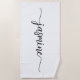 Girly Feminine Minimalist Simple Clean White Monogram Name Signature Script Custom Personalised Summer Beach Towel. This design featuring your first name in a pretty hand lettered style swash tail font signature typography (or calligraphy) on white background. These are easy to customise it. Great stylish feminine housewarming gift, also for birthday, mother’s day, wedding, sweet 16 birthday party, bridal shower, bachelorette party, for graduation party and It’s for the girl who likes simple clean things.