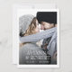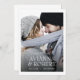 This minimalist Save the Date Card postcard begins with your couple's photo. Your first names are written in a large elegant white serif font text. Save the date is written above in a stylish curved text. The wedding date and location is below.