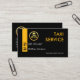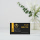 An all black cover is accentuated by a yellow vertical tab stripe which houses your phone contact and your prestigious name. Over at the top is a gold chauffeur taxi driver logo you can use. On the right is the business name "TAXI SERVICE" alongside a slogan caption option near the base of the card; You can change both captions to suit your own service needs.