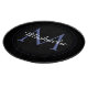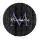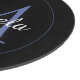Minimalistic blue circle modern monogram with blue initial and white name on black. Personalizable custom name with a serif initial behind on a black colour.