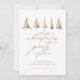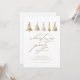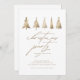 Elegant gold Christmas trees, simple illustration on a white background, customisable party invitation. Elegant minimal script typography and customisable text are in gold: minimalistic gold and white Christmas party invitation design.