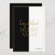 Minimalistic Merry Christmas greeting card with black and white split screen and a gold typography.