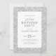 Happy 25th birthday invitation with a white glitter texture background with customisable text in grey.